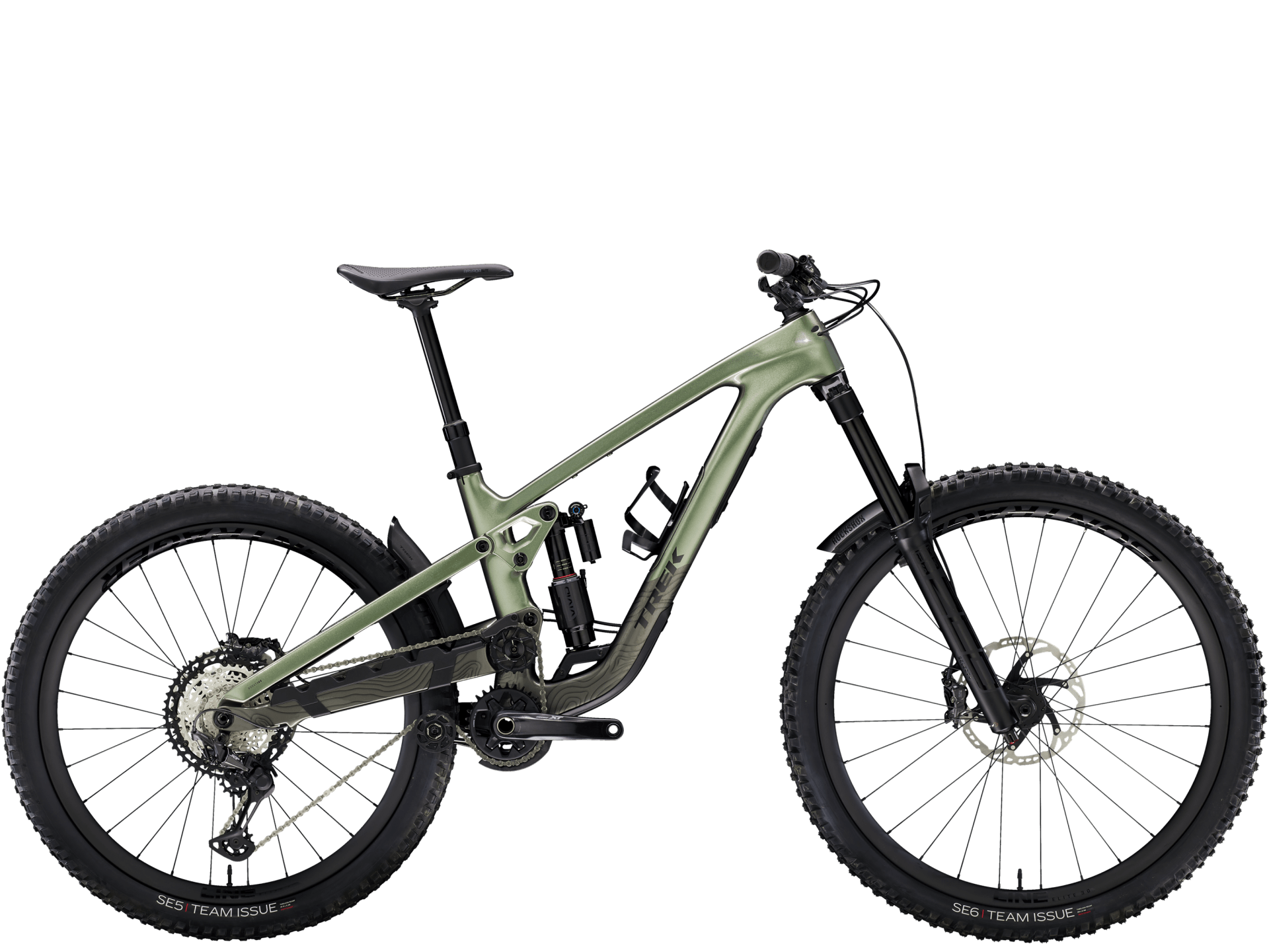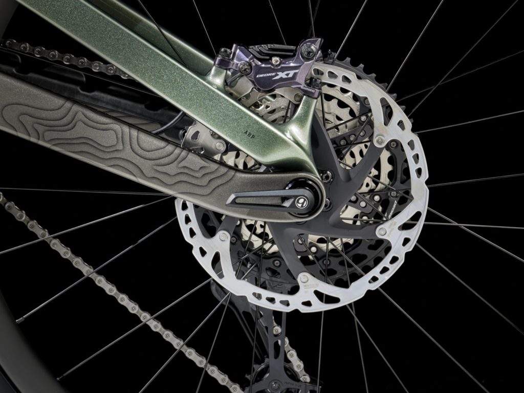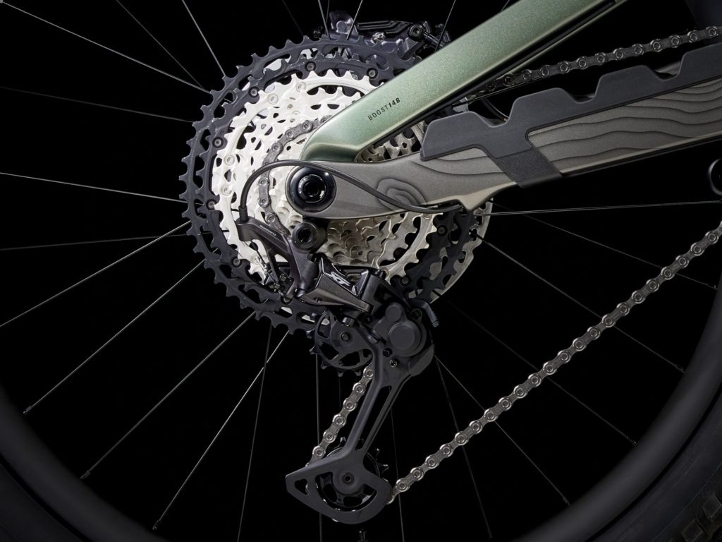 OCLV Mountainカーボンフレームは、ハイピボットサスペンションと内蔵ストレージを搭載。前後とも170mmトラベルを備え、フロントフォークはRockShox ZEB Select+のDebonAirスプリングとCharger 3 RC2ダンパー仕様。リアショックはRockShox Super Deluxe Select+。トレイルの入り口まで余裕で上り返せるギア比を備えたShimano XTドライブトレインと、Bontrager Line Dropperを採用。フロント29インチ、リア27.5インチのマレット仕様Bontrager Line Elite 30チューブレスレディカーボンホイールは、Rapid Driveハブで組まれている。