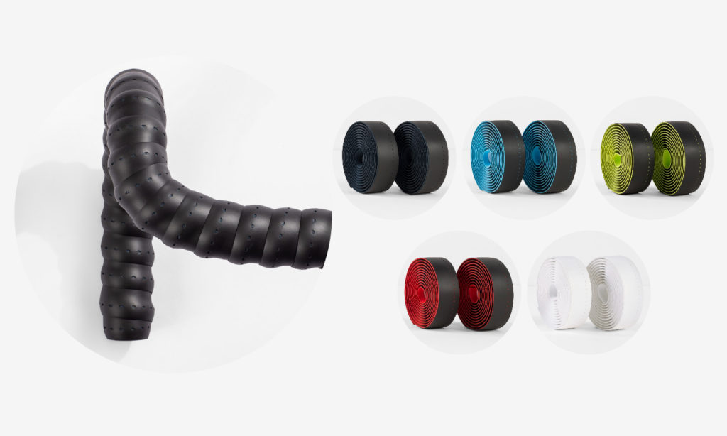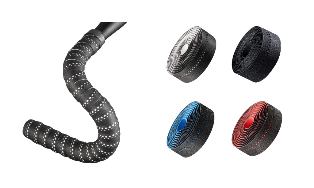 今回紹介する中では最も薄手(厚さ1.6mm)のバーテープ。手にしっかりと食いつくようなグリップ力の高い素材に、格子状の細かい模様と、デザイン面でもアクセントになるパンチング加工で汗や雨でも滑りにくいのが特徴。