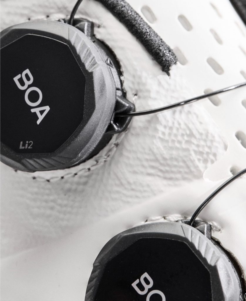 素早い微調整が可能な薄型のデュアルLi2 BOAダイヤルで、簡単に精密なフィット感を調整できる。