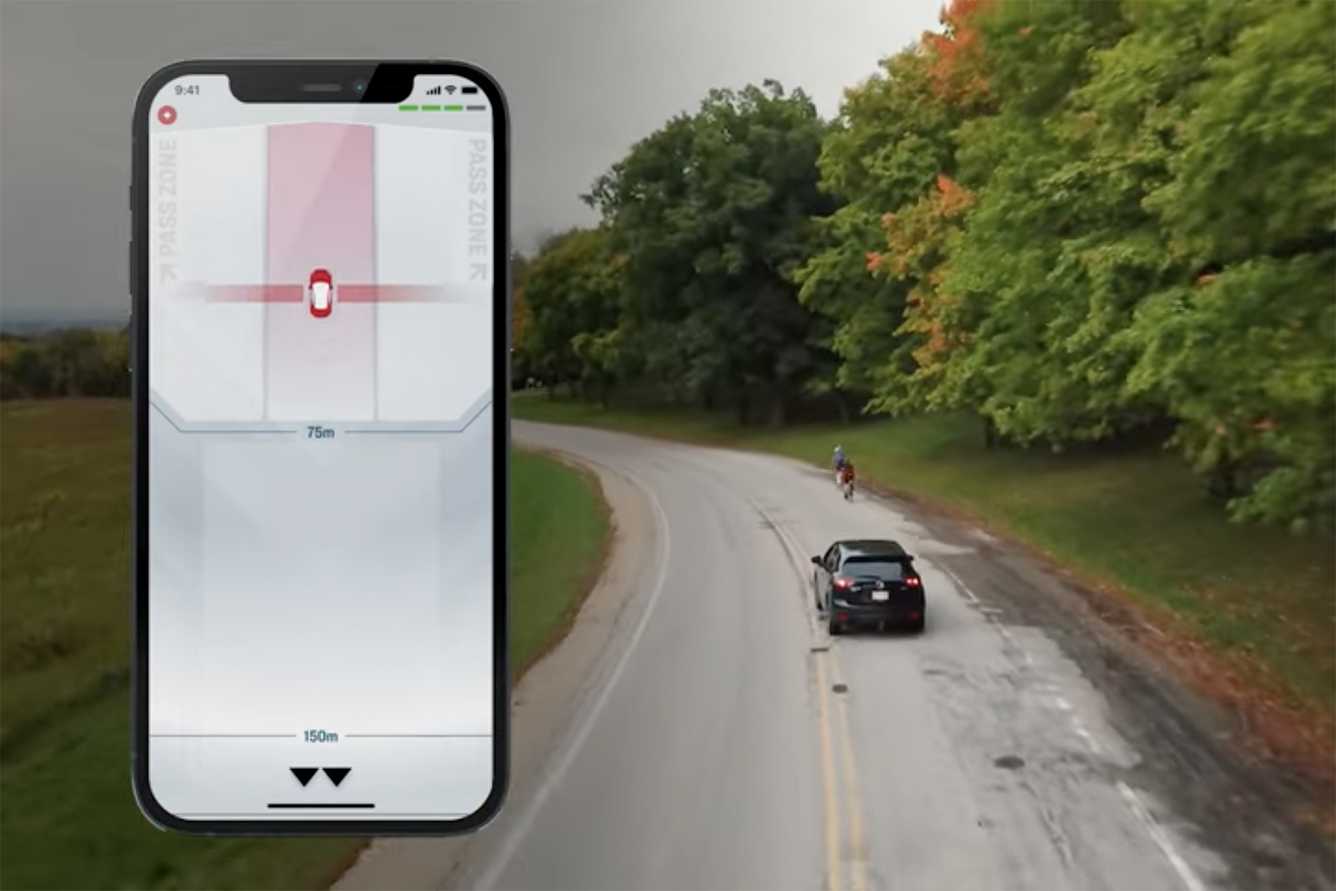 - CarBackとTrek Accesoryアプリをペアリングすると、後方から来る車両の接近と、その通過距離をスマートフォンで確認可能。