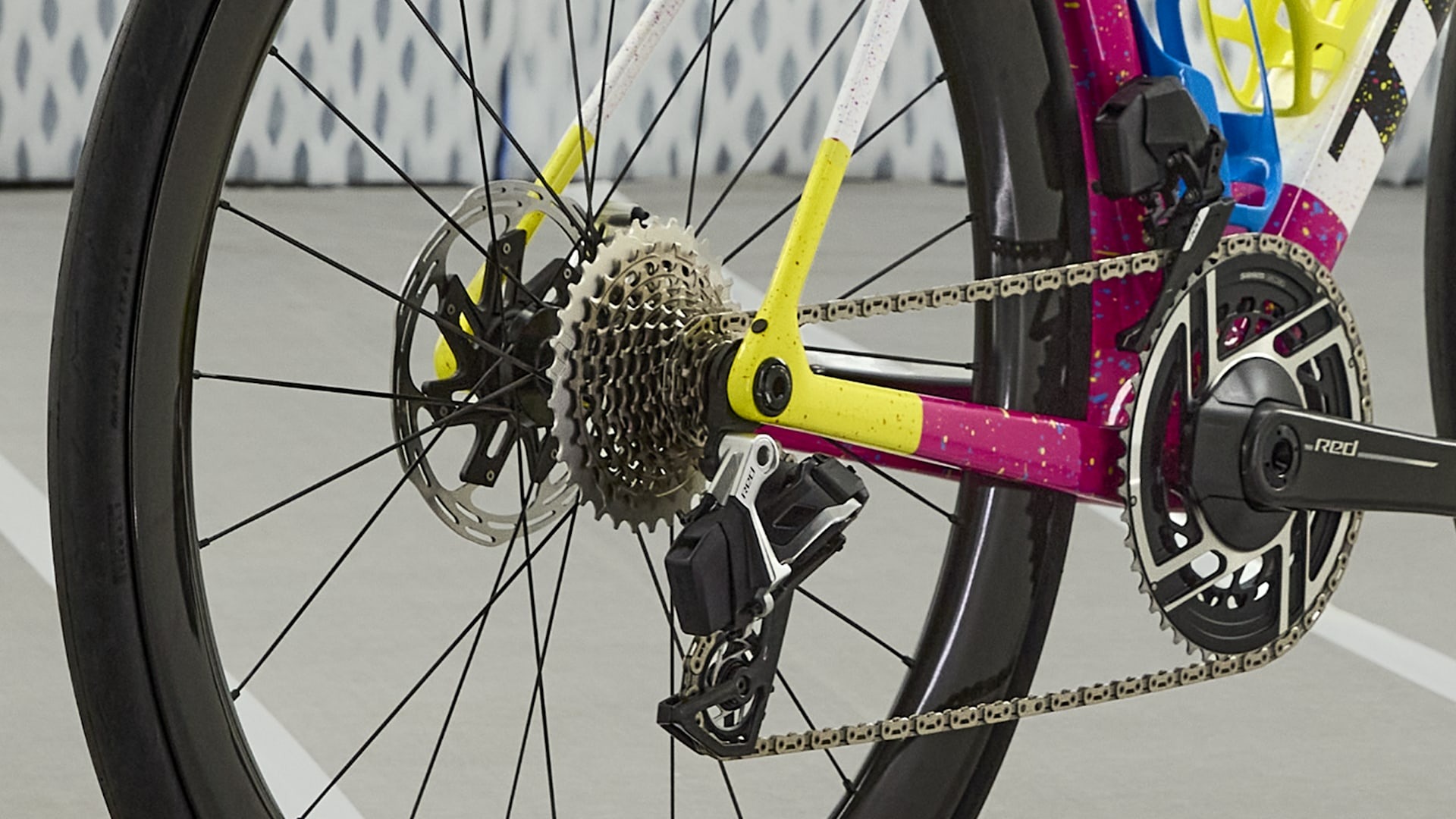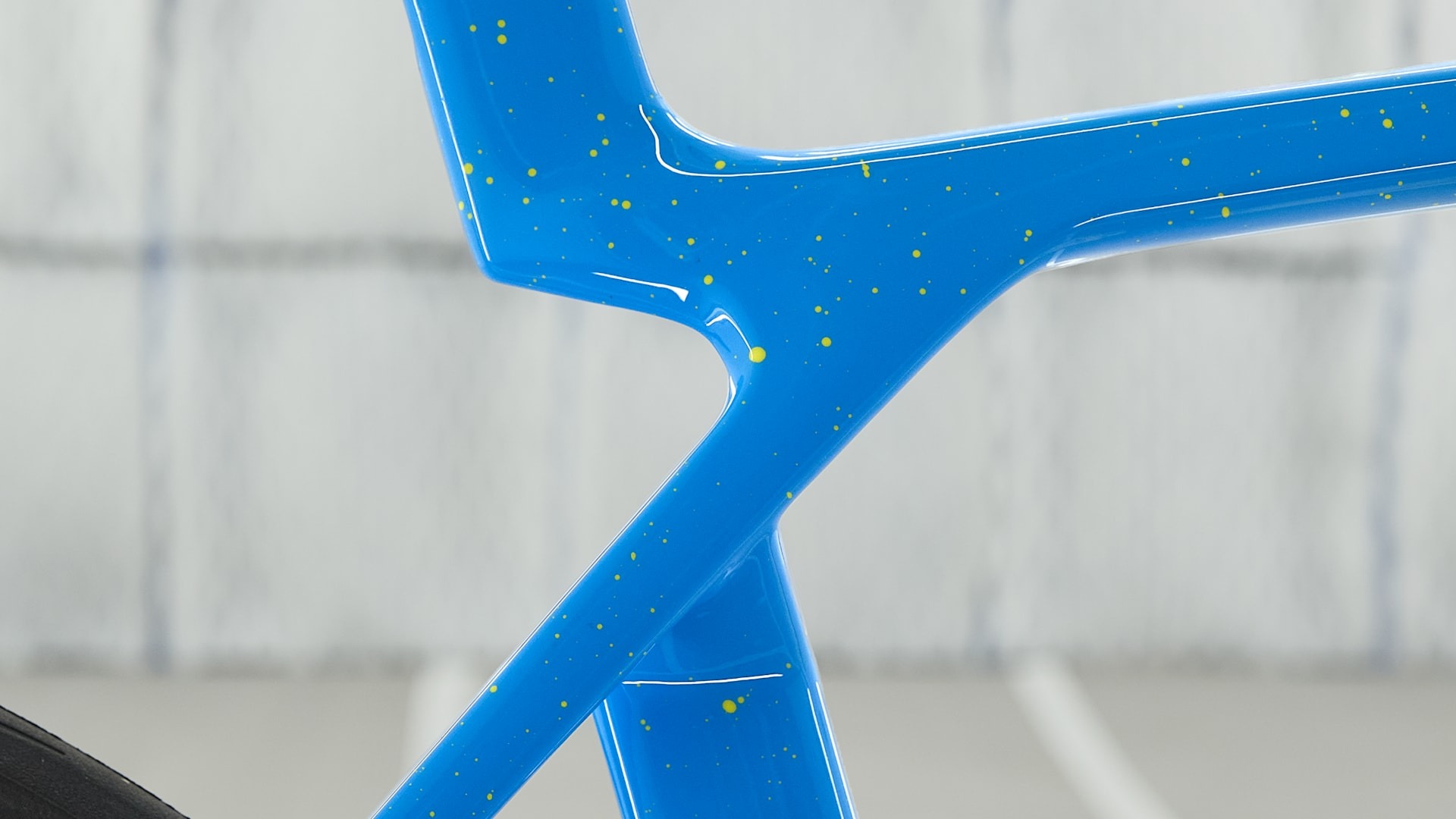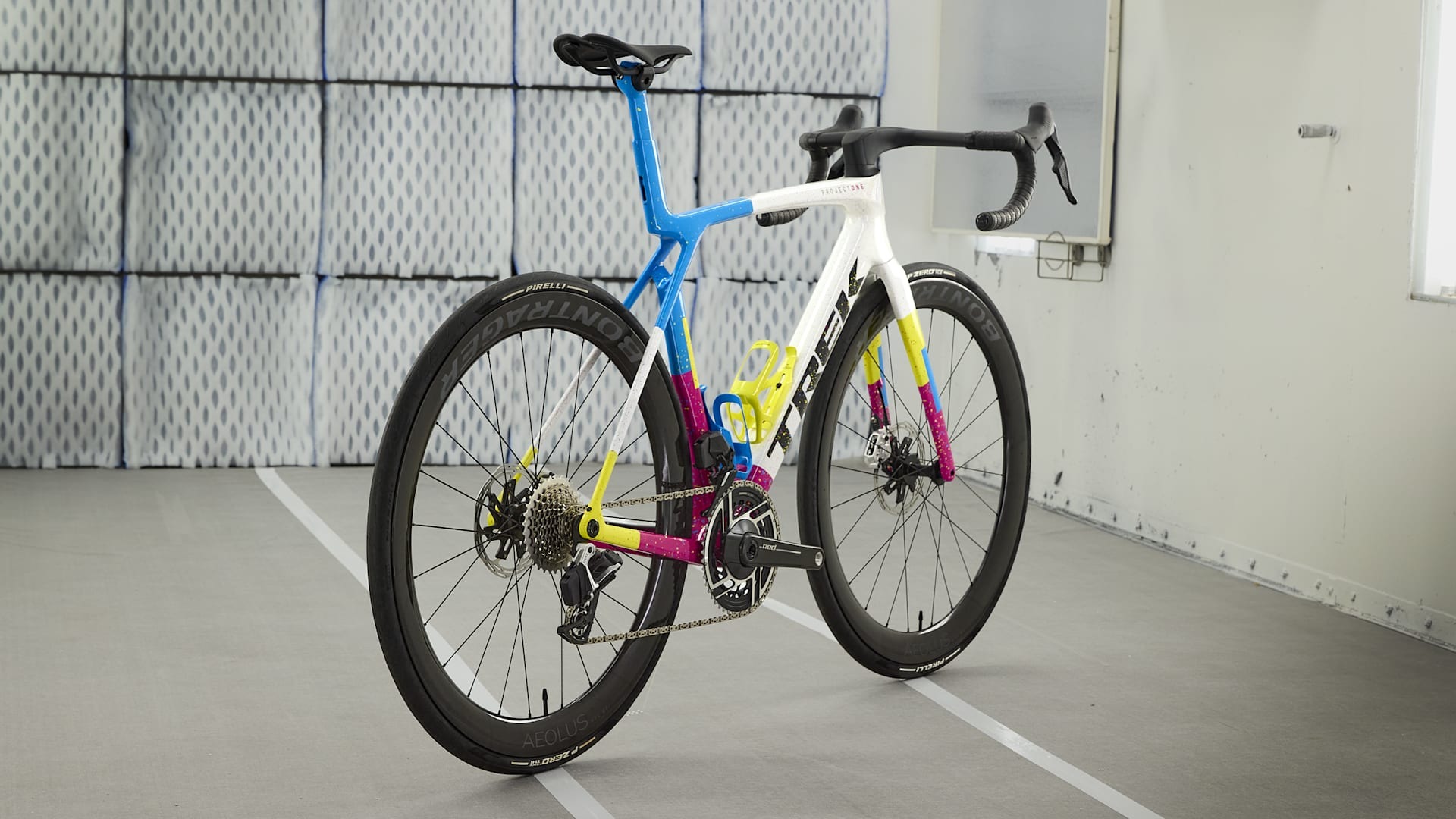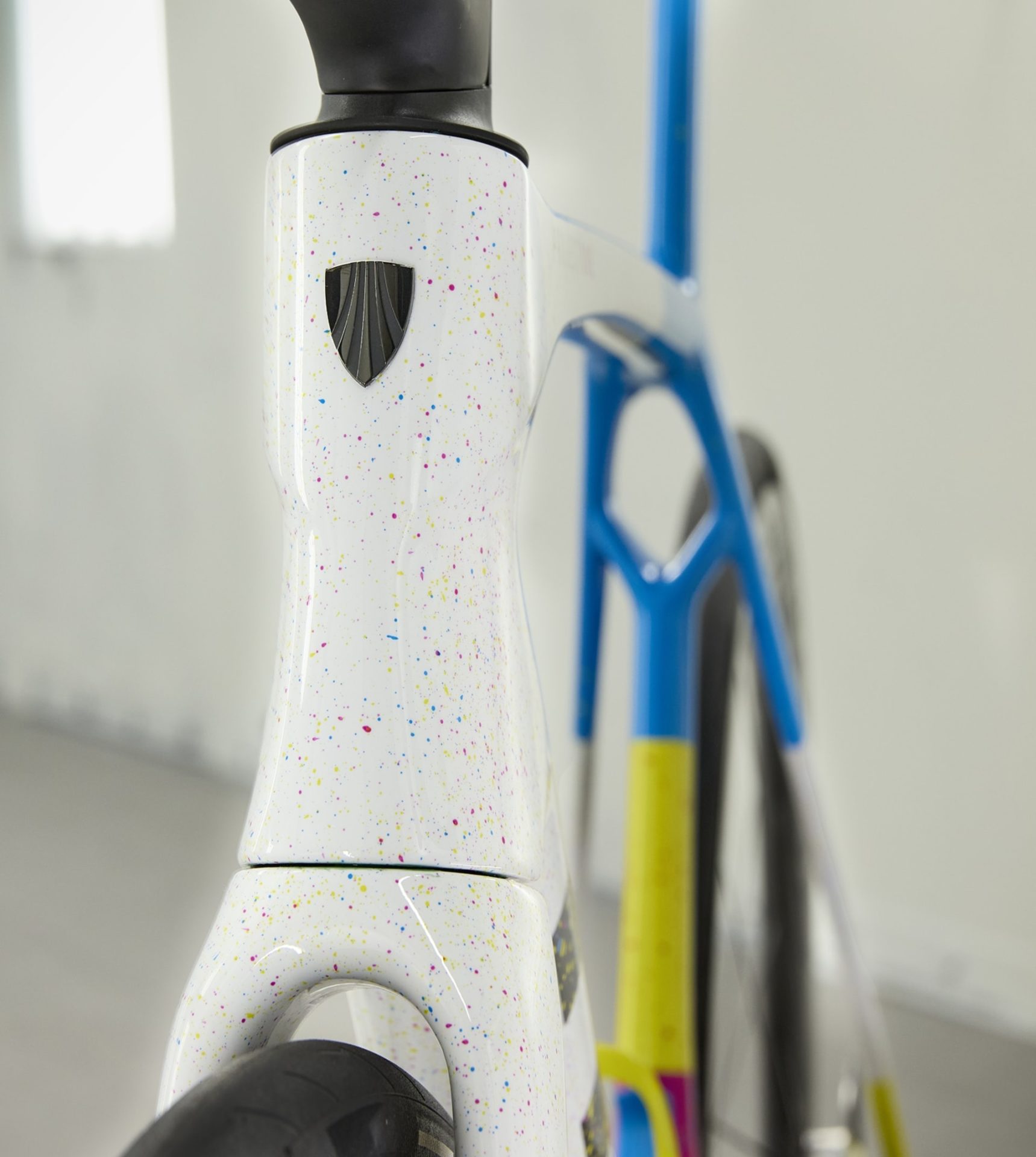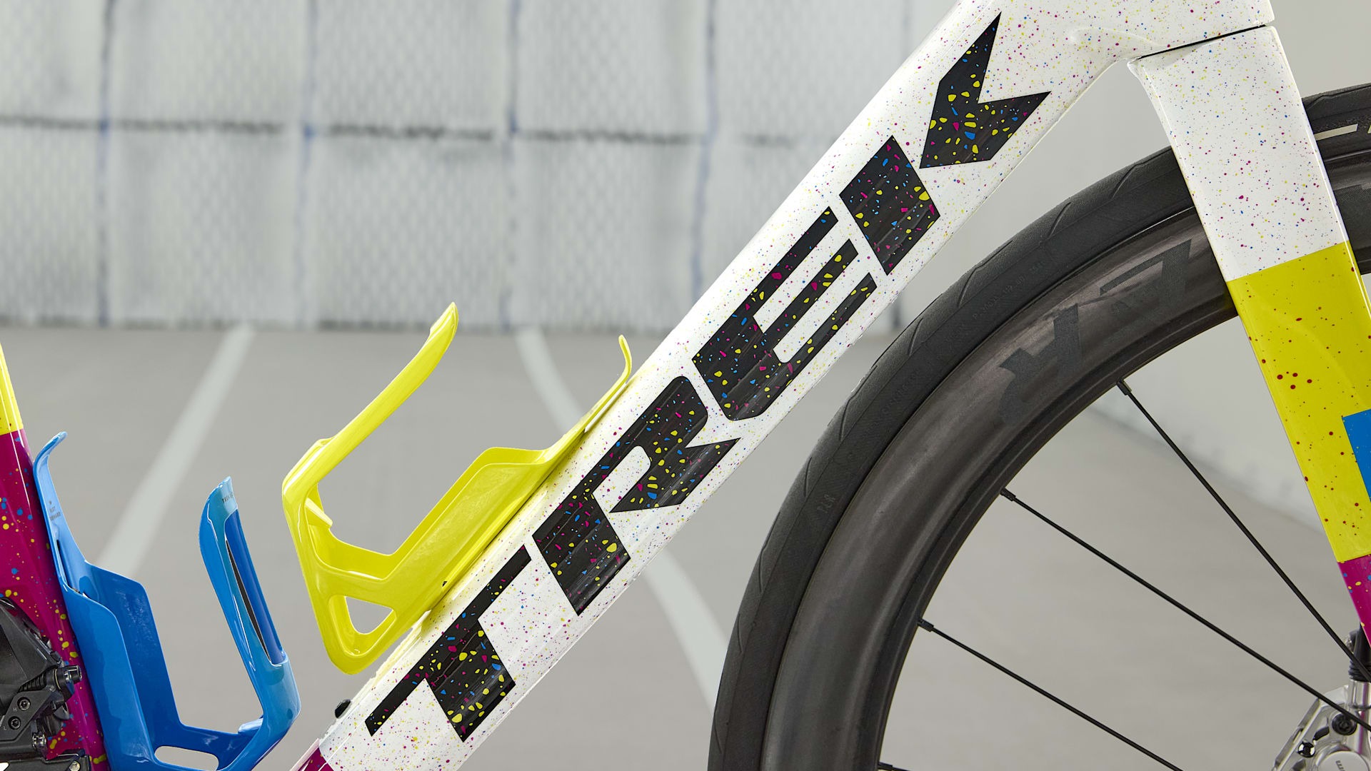 このデザインは、ツール・ド・フランス・フェムス全9ステージに挑むLidl-Trekチームの選手たちにふさわしい特別仕様。幾何学的なラインと、表情豊かなペイントのスプラッシュ(飛沫)が調和し、見る者を引き込む力強さと緻密さを兼ね備えています。